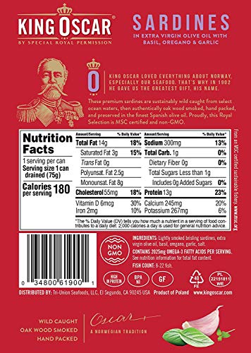 King Oscar’s Royal Selection Brisling Sardines line brings you finest quality, extra small, MSC-certified, sustainably wild-caught fish, flavored with specially selected, simple ingredients in Non-GMO Project Verified 100% extra virgin olive oil. All hand-packed in innovative, transparent-lid, easy-peel cans for super premium quality you can see and taste. The Royal Selection line is for seafood lovers seeking the best for their palates, the best for their bodies, and the best for the planet.